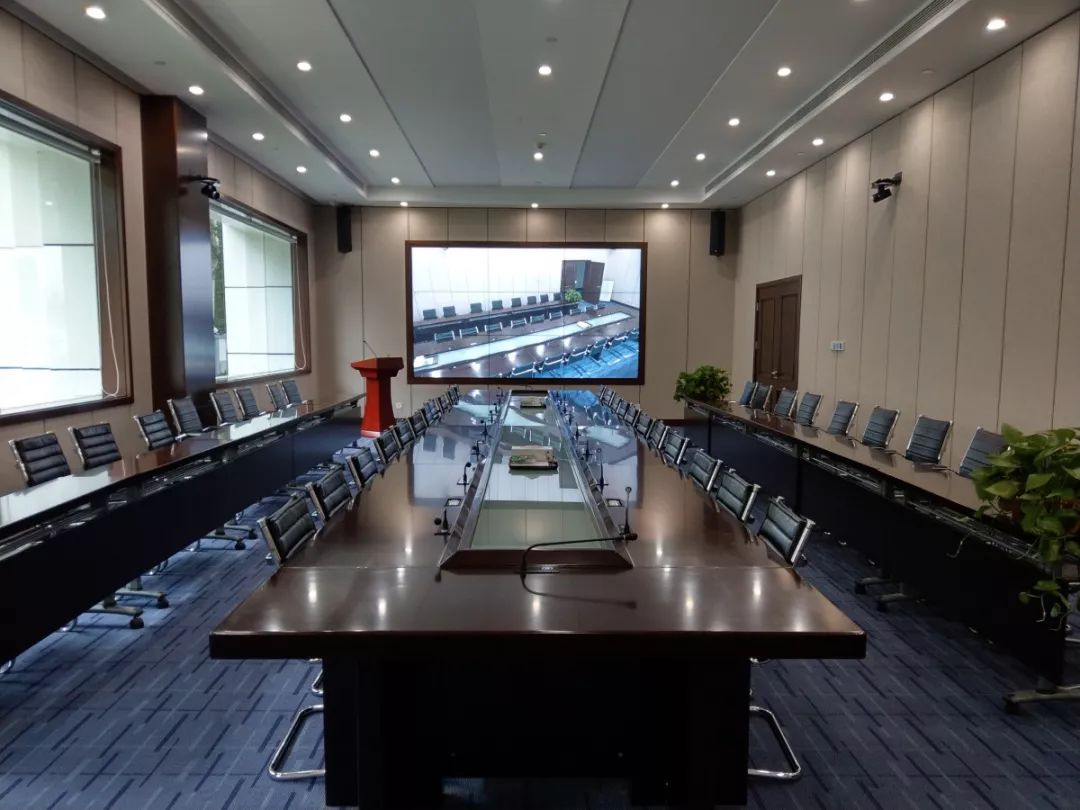 大績效會議室長14.56m、寬6.8m、高3.5m,面積約99㎡,可容納坐席52個,主要用于產(chǎn)業(yè)集團績效回顧會、集團大會主會場等會議場景。
