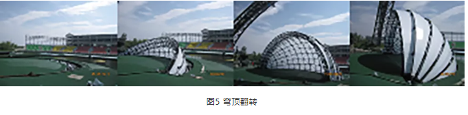 室外表演或?qū)嵕把莩鐾枰蟮奈枧_設(shè)備,提供與演出環(huán)境相適應(yīng)的大型表演舞臺,并根據(jù)演出內(nèi)容進行實時轉(zhuǎn)換。常規(guī)的平移、升降已無法滿足需求,需要平移、旋轉(zhuǎn)、傾斜、升降等運動形式的組合,實現(xiàn)大型舞臺場景的變化。如云南“希夷之大理”的旋轉(zhuǎn)升降組合穹頂翻轉(zhuǎn)技術(shù)的應(yīng)用。其主舞臺由旋轉(zhuǎn)相切的圓形組成,天棚穹頂是舞臺整體眼睛創(chuàng)意的眼珠,翻轉(zhuǎn)升起后可以作為投影幕使用。其中,五瓣穹頂既要相互分離,還要互相支持依靠,保證輕薄球面結(jié)構(gòu)的整體穩(wěn)定和變形控制,采用主次骨架結(jié)構(gòu)、同軸旋轉(zhuǎn)、液壓頂推、滾動支撐、分離掛鉤等方法,實現(xiàn)穹頂翻轉(zhuǎn),如圖5所示。采用同心軌道、多點浮動鏈輪驅(qū)動、虛擬圓心定位、電纜滑車供電、液壓系統(tǒng)隨動等方式,實現(xiàn)大型圓弧轉(zhuǎn)臺的360°旋轉(zhuǎn);采用自主液壓同步控制軟件,有效解決了不同液壓驅(qū)動設(shè)備的同步問題,穩(wěn)態(tài)同步控制精度小于5 mm。