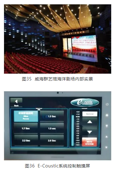 如前所述,E-Coustic系統(tǒng)基于世界最著名的專業(yè)混響器研發(fā)生產(chǎn)企業(yè)Lexicon而來,其獨(dú)到的混響算法為這種嵌入式系統(tǒng)提供了一個(gè)非常好的再生聽感,同時(shí)E-Coustic先進(jìn)的時(shí)變技術(shù),也很好地保證了系統(tǒng)的穩(wěn)定性。本系統(tǒng)中,傳聲器與揚(yáng)聲器的距離很近,但很好地抑制了聲反饋和聲染色的問題。同時(shí)系統(tǒng)使用較少的傳聲器-揚(yáng)聲器通路,即能達(dá)到改變聲學(xué)環(huán)境的效果,也很大程度的降低了施工難度,這也是嵌入式系統(tǒng)的固有優(yōu)勢之一。威海市群藝館海洋劇場內(nèi)部實(shí)景及E-Coustic控制觸摸屏分別如圖35和圖36所示。