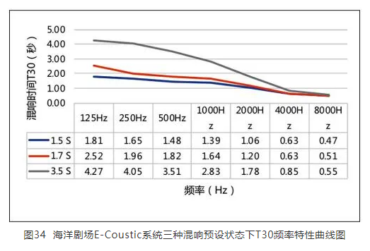 本項(xiàng)目總共進(jìn)行了兩次調(diào)試,第一次調(diào)試完成后,客戶在使用過程中感覺混響時(shí)間不足以滿足廳堂所有的應(yīng)用場景,故又根據(jù)客戶的需求進(jìn)行了第二次調(diào)試,增長了混響時(shí)間。除了廳堂自身的固有聲學(xué)條件外,經(jīng)歷了兩次調(diào)試的E-Coustic系統(tǒng)共設(shè)置了10個(gè)混響時(shí)間預(yù)設(shè)模式,分別為1.5 s、1.7 s、1.9 s、2.2 s、2.6 s、2.9 s、3.2 s、3.5 s、4 s和6 s,同時(shí),還設(shè)置了一個(gè)對(duì)廳堂本身聲學(xué)問題進(jìn)行一定程度修復(fù)的語音舒適模式。現(xiàn)場調(diào)試完成后選取了1.5 s、1.7 s及3.5 s預(yù)設(shè)進(jìn)行了實(shí)地測量,T30的測量結(jié)果如圖34所示。此外,系統(tǒng)本身對(duì)初始時(shí)間間隙、早期反射聲、混響能量等聲學(xué)參數(shù)均可單獨(dú)調(diào)節(jié),這也極大地豐富了系統(tǒng)的綜合調(diào)控能力,使整個(gè)聲學(xué)空間的真實(shí)感和內(nèi)部參數(shù)間的適配度得以有效提升。