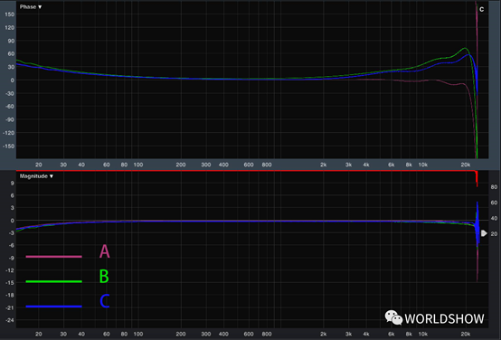 由圖可見三款產品的頻率響應都能達到要求,幅頻響應在±0.5dB之內,相頻響應都在±30°之內,這其中還有一定的測量誤差。而三者之間的幅頻響應差別還是顯而易見的,B型號的頻率響應明顯比A和C差一些。