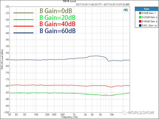 圖5. B型號調音臺話放增益在不同時的THD+N Level