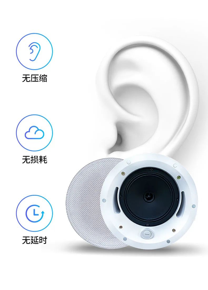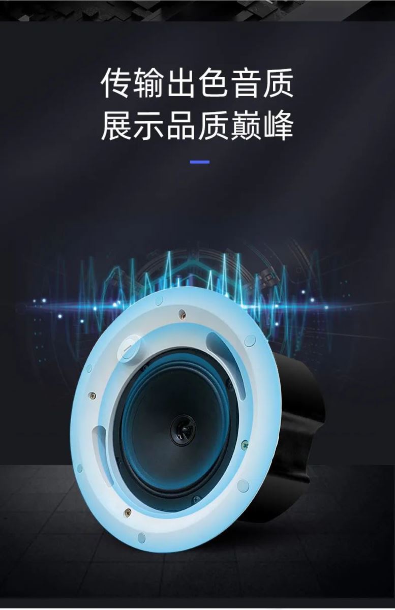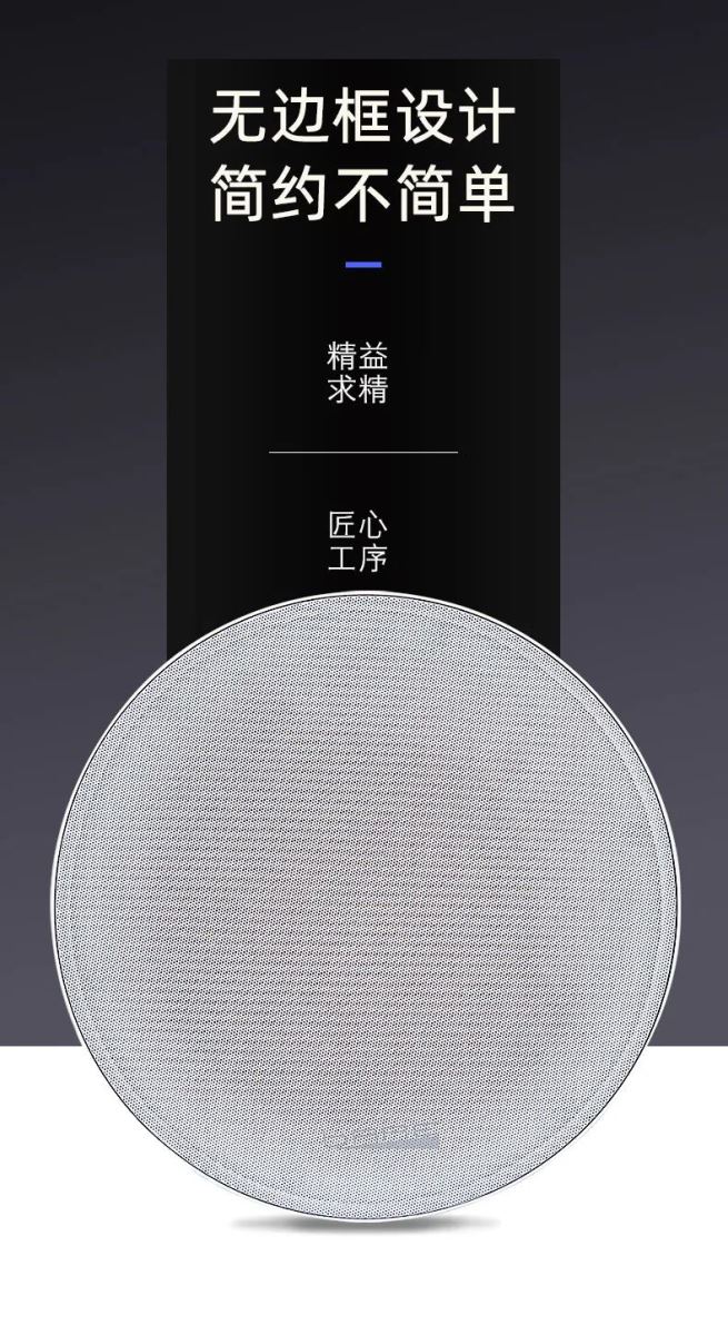 從外形上,我們圍繞著極簡主義風格設計,嚴選金屬材質(zhì),硬度較強,能夠大大減少諧振的產(chǎn)生,將低、中、高三頻還原的更精準。網(wǎng)罩采用了無邊框設計,加上顏色純黑的磨砂質(zhì)感,視覺上可塑性強,更好契合墻面和天花。