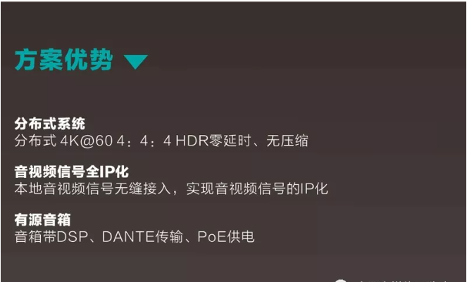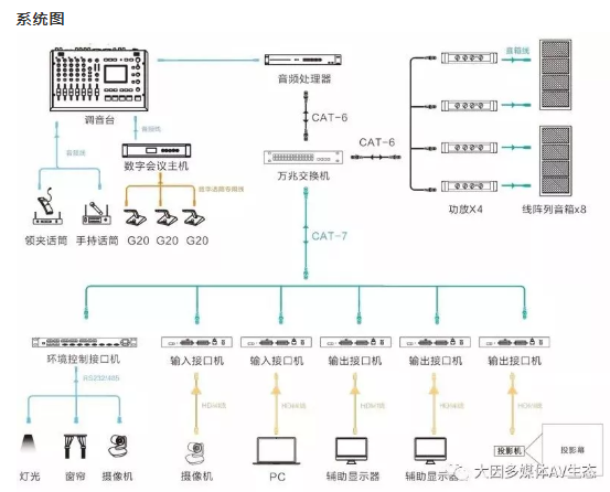 現代型會議室最基本的用途是開圓桌討論會議、視頻會議、專題匯報會等。因此需要滿足會議語言類的擴聲和視頻顯示的功能。同時如果作為分會場使用時需要滿足把主會場的音視頻信號實時的發送到會議室來。
