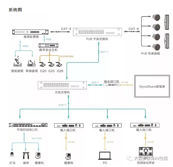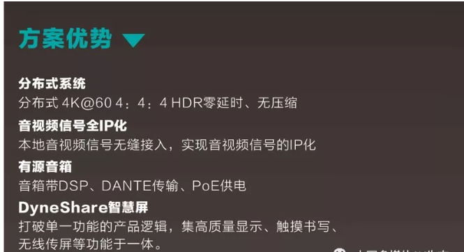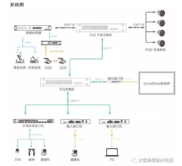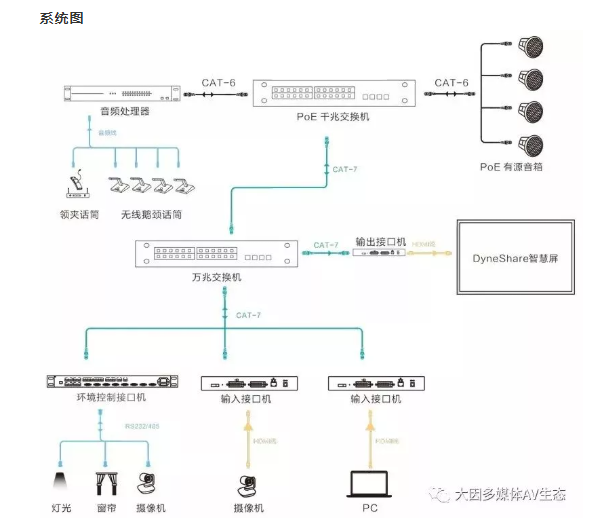 會議室是信息交互的平臺,實現信息的傳遞主要是兩種方式,就是視和聽。視覺的內容主要是圖像和文字資料,聽覺的內容則是聲音。DANACOID通過DyneNetDynePro系列打造音視頻全IP化系統。通過網線完成音視頻信號的傳輸、管理和控制,打造最佳的會議室視聽效果。