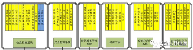 醫(yī)院智能化系統(tǒng)可拆分6大子系統(tǒng),包括信息基礎(chǔ)設(shè)施系統(tǒng)、公共安全系統(tǒng)、醫(yī)護專用系統(tǒng)、建筑設(shè)備管理系統(tǒng)、綜合集成管理系統(tǒng)、機房工程。