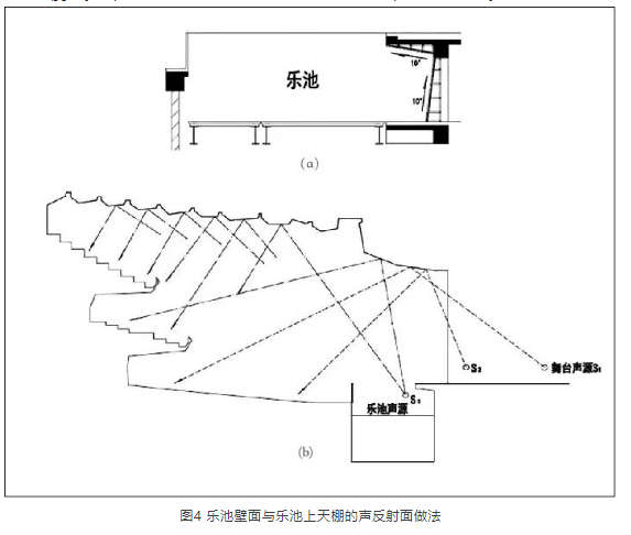 需要注意的是,初步按此確定臺(tái)口天花板反射面后,還要適當(dāng)調(diào)整此面,盡可能兼顧近次反射聲對(duì)樂(lè)池的覆蓋。當(dāng)然還可利用樂(lè)池的某些壁面作反射面,如圖4所示。