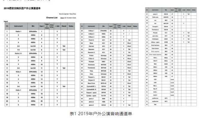 還有一種比較常見的擺位,在1777年由德國作曲家阿貝福格勒提出,19世紀下半葉被廣泛采用,通常稱之為歐式(德式)擺位。這種擺位關系下,有利于首席小提和首席大提、大提和貝斯的交流,特別是在合奏樂段的部分。在該演出中,一提和二提兩組相對而坐,會有一提二提一問一答的樂段,使聲像形成立體效果,且由于二提的f音孔朝向舞臺內側與f音孔朝向觀眾的一提音色也有著微妙并明顯的差異。任何一種擺位都無法十全十美,直到現在對于采用哪種擺位方式,音樂家們還多有爭執。一種觀點認為,德式的擺位需要得到側墻面的支持,對于音樂廳建聲環境要求較高;還有一種觀點認為,美式的擺位雖然能夠更加容易分辨不同的樂器組,但會使樂隊右側低頻較重,導致空間上的不平衡。一場音樂會同時演奏橫跨不同時期的曲目,這些曲目創作和演奏時的樂團擺位都不盡相同,例如上文提到的一提和二提一問一答的效果很容易湮沒在其他擺位中相鄰的聲部里。但現場隨著曲目的要求變換樂隊擺位并不現實,采用電聲系統的調整可在一定程度上彌補改善擺位帶來的缺點,通過調節EQ、混響、PAN等手段能夠實現各個聲部相對定位關系的改變,從而更好地表現不同作品。例如上文提到的一提和二提一問一答效果的實現(當然要注意點補傳聲器和主傳聲器的關系調整,也需要在效果和回授前有效增益之間找到平衡),以及特定擺位帶來的空間不平衡,再加之合理地使用如DearVR MICRO等融入HRTF( Head-Related Transfer Function )原理的空間模擬插件,從而“創造”出不同的空間體驗。根據美式擺位,合唱團一般會由女聲站在男聲前面,按照從左到右女高音-女中音-男高音-男低音來獲得平衡。對于合唱團來說,音色統一和聲音足夠清晰是比較重要的。合唱由多個非相干聲源組成,雖然團員按照站位排開,但在空間上對某一個團員甚至一個聲部進行分辨都是困難的。在音樂廳的舞臺上,由于側墻及返聲板的反射,合唱給人以包圍感、融合感。但在戶外的環境里沒有了這些反射聲,合唱的音效就要通過拾音、混音實現。合唱團的拾音一般只是3~4支傳聲器,拾音距離按照3∶1規則分布,以減少相位抵消。通常情況下,離傳聲器較近,尤其在傳聲器軸線的合唱演員聲音會較為突出,使得整個合唱在整個系統里的定位固定,群感融合度不夠。通過使用壓縮器修整冒尖的聲音,通過使用效果器來模擬早期反射聲,以提高整體的融合度。室外的現場擴聲體驗與音樂廳內“沉浸”的聽聞感受有著從底層邏輯上的不同。音樂廳內的現場體驗決定于音樂廳的聲學環境及聽音位置。室外現場擴聲體驗決定于拾音、混音技巧以及擴聲系統的設計,通過技術手段實現聲場的重構、再構,達到聽聞的一致性。隨著電聲技術發展,將給現場聽聞帶來更豐富、更舒適的體驗,亦如當年技術發展(動力學、材料學,甚至是建筑技術)對于歐洲樂器制作、演奏、作曲技法乃至音樂風格產生深遠而持久的影響。2.3.2 拾音的設計思路由于調音臺輸入通道的限制,沒有對每一件樂器進行單獨拾音,采用對聲部首席及前檔、對聲部整體拾取的方案,見圖5;除去演出流程相關無線傳聲器、視頻等,樂團合唱團以及獨奏共使用72個通道,見表1。由DPA4006C作為主傳聲器,SCHOEPS MK2s用于側展,相當于與主傳聲器形成了一個大的Decca Tree拾音制式。主傳聲器負責整個樂隊的基準平衡,側展傳聲器用于構建樂團的空間效果。