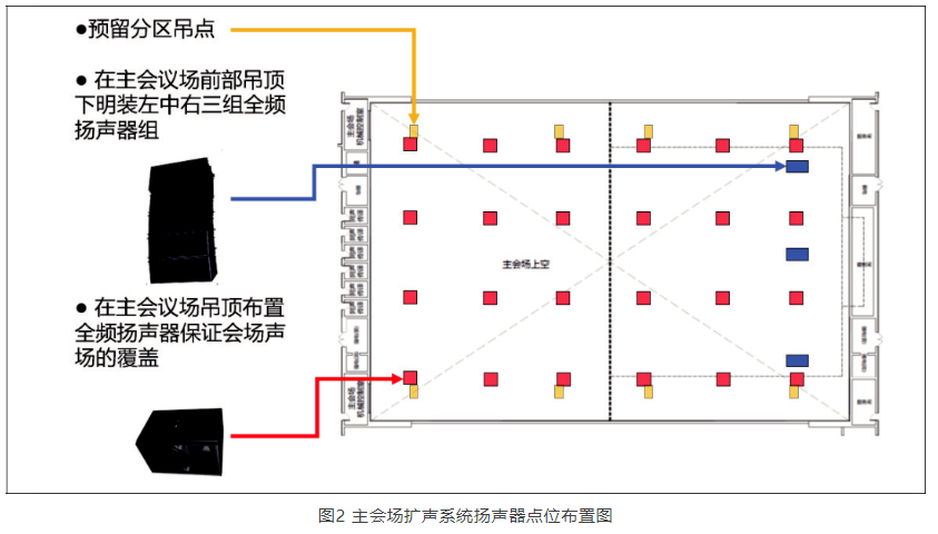 在大會(huì)模式下,主揚(yáng)聲器系統(tǒng)采用左中右三聲道方式,由24只線陣列全頻揚(yáng)聲器和4只次低頻揚(yáng)聲器組成,分別通過電動(dòng)葫蘆吊掛于主席臺(tái)前沿頂部。主揚(yáng)聲器系統(tǒng)吊點(diǎn)位置參照主席臺(tái)區(qū)域布置,并錯(cuò)開主通道區(qū)域上方空間。同時(shí),在會(huì)場吊頂內(nèi)暗裝24只大功率全頻揚(yáng)聲器分散均勻覆蓋全場,可與主揚(yáng)聲器系統(tǒng)互為補(bǔ)充,如圖2所示。