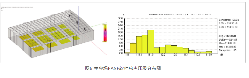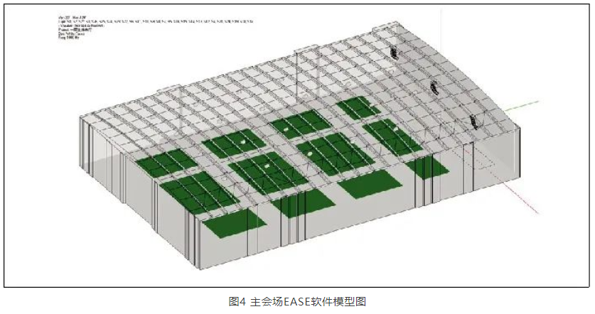 為驗(yàn)證擴(kuò)聲系統(tǒng)可行性,筆者對(duì)主會(huì)場做了EASE聲場模擬,如圖4、圖5、圖6所示,滿足設(shè)計(jì)目標(biāo)。