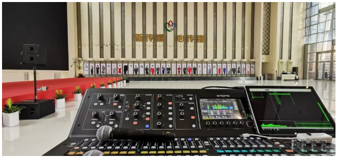 常州現代傳媒中心大廳,擔任著接待會客重任,也是展示傳媒形象與文化的重要場所。此次為其搭建擴聲系統的過程中,存在著許多困難:大廳頂層較高,舞臺較寬,舞臺左右兩邊裝修和造型各異,對面是玻璃大門,瓷磚地板,聲場環境不是很好,很多音響系統在此發揮不出好的效果。