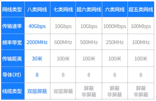 這里有必要提下八類網(wǎng)線,跟七類網(wǎng)線一樣的是雙層屏蔽(SFTP),它擁有兩個(gè)導(dǎo)線對(duì),2000MHz的超高寬屏,傳輸速率高達(dá)40Gb/s,但它最大傳輸距離僅有30m,故一般用于短距離數(shù)據(jù)中心的服務(wù)器、交換機(jī)、配線架以及其他設(shè)備的連接。雖然八類線傳輸距離短,但傳輸速率和頻率帶寬是遠(yuǎn)遠(yuǎn)超過(guò)其他類的。