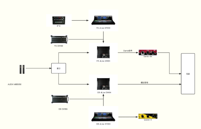 OB調音臺至擴聲系統通過傳統的模擬信號進行傳輸,并在OB房間的S7000臺面上加裝了一張Waves卡 用于OB混音。