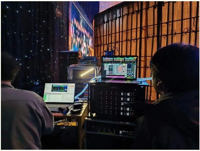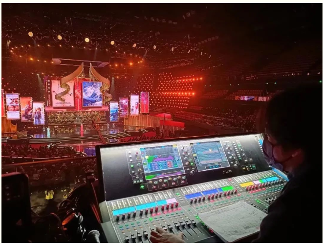 我公司設計團隊為西安曲江競技中心提供了固定安裝部分的擴聲系統解決方案。本屆電影節開、閉幕式現場使用了兩張Allen&Heath dLive S7000調音臺分別作為PA和OB調音臺,搭配兩個DM64引擎作為處理核心。
