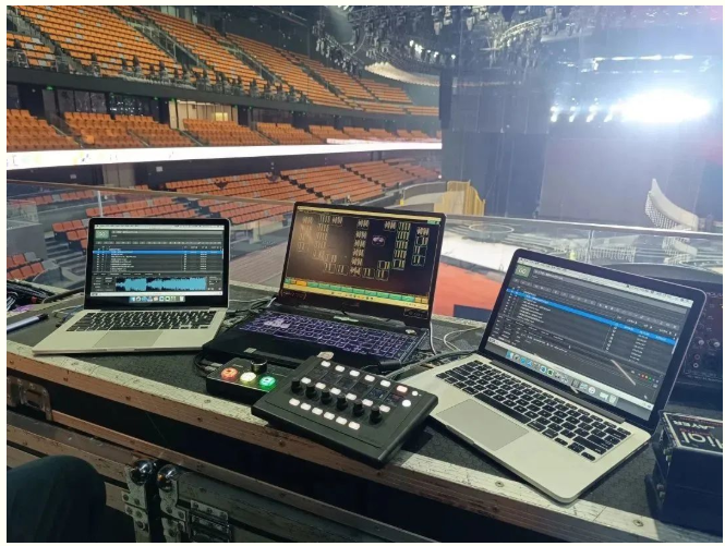 在前期進場搭建時,因遲遲無法確定PA控臺的最終位置,所以選擇了使用電腦端的Allen&Heath dLive director控制軟件與現場PA調音臺和OB調音臺的混音機架進行連接,從而快速方便地應用于前期的系統調試工作,使音頻工程師免于在3樓控臺到1樓舞臺之間奔波。