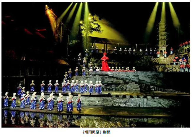 其實(shí),這個方法之前也曾多次使用。不過這次的實(shí)踐讓筆者發(fā)現(xiàn),很多情況下聲音的獨(dú)特效果可以根據(jù)舞美場景,甚至利用舞美裝置的特性來實(shí)現(xiàn)。這一點(diǎn)以后也可以繼續(xù)跟音響師們研究探討,從中發(fā)現(xiàn)、挖掘并再現(xiàn)出契合戲劇創(chuàng)意的聲音效果。例如,國外有的錄音棚用老教堂或者工廠廠房改造,以得到想要的聲音效果,包括好萊塢的電影錄音。這具有無限拓展的可能性,因為每一種聲音在不同的空間都會是不同的,關(guān)鍵也在于音響師是否有主觀創(chuàng)新的想法,畢竟對于多數(shù)戲劇音響設(shè)計來說,音響師首先要保證的是戲劇對聲音的基本要求,然后才是個性化需求。另外,音響師對舞美空間的解讀也尤為重要,舉個例子,幾年前參加湖南鳳凰的《煙雨鳳凰》實(shí)景演出項目的舞美設(shè)計,景的縱深有50 m多,一側(cè)是用于造景的山,一側(cè)是吊腳樓,中間風(fēng)雨橋作為兩者的連接,遠(yuǎn)處縱深就是利用實(shí)景的山和樹林。該劇的音響師就根據(jù)這樣一個悠遠(yuǎn)的空間環(huán)境,制造從左到右的聲像差,形成由遠(yuǎn)及近的聲音效果,的確讓觀眾感受到了空間距離上聲音傳遞效果,十分契合舞美所營造出的氛圍。