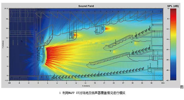當(dāng)獲得足夠的場地信息之后,需要利用揚聲器廠家提供的模擬軟件(或者通過Ease Focus這種基于GLL文件的通用設(shè)計軟件)進行建模,這些軟件可在可視化的條件下,實時調(diào)整并計算不同設(shè)計方案的覆蓋均勻度以及聲壓級分布,較為復(fù)雜的模擬軟件(如Ease)甚至可以將反射和墻面材質(zhì)的吸聲特性都考慮在內(nèi),實現(xiàn)對反射情況的模擬(見圖1)。系統(tǒng)建模和預(yù)測的重要作用在于讓系統(tǒng)工程師在裝臺開始之前就能夠做好全部的計劃和準(zhǔn)備工作,進而起到減少正式施工時長并提高工作效率的作用。