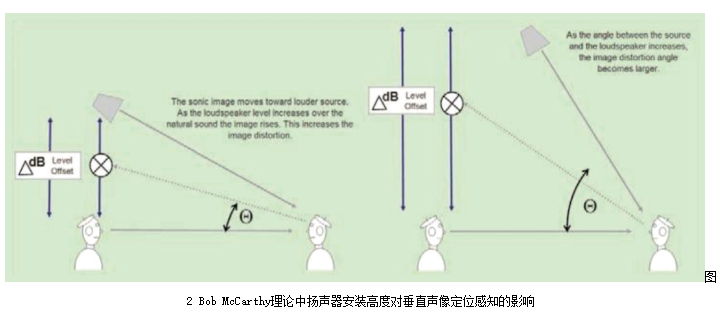 任何解決方案都存在一定的局限性。這些局限性主要來自于劇場的尺寸、舞臺的結(jié)構(gòu)、觀眾席座位的分布以及劇場的聲學(xué)環(huán)境等要素。使用中置揚聲器對于那些舞臺鏡框特別高的場地可能不是一個好的選擇。吊掛的高度決定了聲源發(fā)出的位置(見圖2),若揚聲器與觀眾席垂直方向的夾角大于30°,位于前排的觀眾就有可能會感覺到垂直方向上的聲像漂移,產(chǎn)生人聲或?qū)Π讈碜灶^頂而非前方的感覺。此時,設(shè)計時可以考慮通過臺唇補聲系統(tǒng)來覆蓋前排觀眾席,中置系統(tǒng)從3排或4排之后的區(qū)域開始覆蓋。