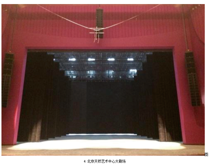 標(biāo)準(zhǔn)劇場中,中置揚聲器組的安裝通常分為暗裝和明裝兩種。暗裝一般是安裝在舞臺鏡框上沿預(yù)留的聲橋當(dāng)中,如北京天橋劇場(圖3)。明裝則是吊掛在舞臺燈桿或預(yù)留的吊點上,如北京天橋藝術(shù)中心大劇場(圖4)。暗裝對觀眾的視覺影響最小,如果劇場擴聲系統(tǒng)設(shè)計合理,建筑聲學(xué)指標(biāo)達標(biāo),且在鏡框高度不是很高的情況下,劇場中置聲道暗裝是最好的安裝方式。但是國內(nèi)劇場的實際情況并不樂觀,且不同演出的系統(tǒng)工程師和音響設(shè)計師都有各自的設(shè)計和考量,暗裝中置聲道位置又基本不可調(diào)整,所以很多劇場中暗裝的中置聲道使用率很低。明裝的中置聲道更便于安裝、拆卸以及調(diào)整,更加適合流動性強的演出,因此,越來越多的現(xiàn)代化劇場采用這種安裝方式。