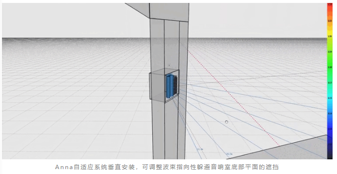 在暗裝的方式下音響室空間通常狹小緊湊。在本項(xiàng)目中,音響室的底部平面距離陣列僅10厘米。如果采用傳統(tǒng)線陣列的擴(kuò)聲系統(tǒng),陣列會(huì)形成J字型物理姿態(tài),不僅占用較大的安裝空間,J型底部的音箱單元還有可能將聲能投射到音響室的底部平面上,導(dǎo)致大部分高頻能量無(wú)法穿透出來(lái),從而無(wú)法覆蓋到一部分前區(qū)的觀眾區(qū)。選用Anna,它的垂直吊裝方式既能節(jié)約了安裝空間,還能將高中低頻單元統(tǒng)一的盡可能靠近透聲幕,躲避音響室底部平面對(duì)波束的遮擋,最終實(shí)現(xiàn)幾乎全場(chǎng)的覆蓋。