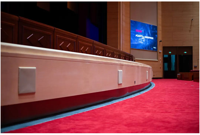 舞臺(tái)臺(tái)唇固定安裝了多只CMI5,為觀眾席前排座席補(bǔ)充中高頻響應(yīng)。CMI5是采用同軸設(shè)計(jì)的超緊湊兩分頻揚(yáng)聲器,可以提供優(yōu)秀的指向性控制和均勻一致的聽(tīng)音體驗(yàn)。針對(duì)安裝位置過(guò)高,而造成的兩側(cè)主擴(kuò)揚(yáng)聲器覆蓋不足的情況,在左右八字墻大屏下方位置,固定暗藏了MKD896點(diǎn)聲源揚(yáng)聲器予以補(bǔ)充。